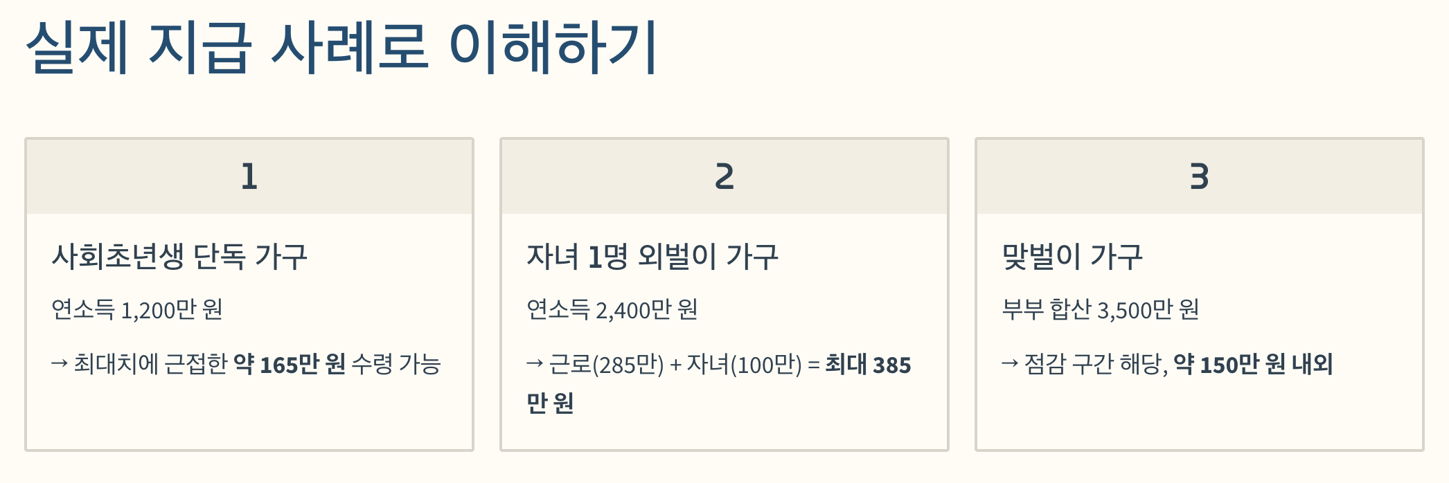 사례 3 (맞벌이 가구): 부부 합산 소득이 3,500만 원인 경우, 점감 구간에 해당하여 약 150만 원 내외의 장려금을 수령하게 됩니다.